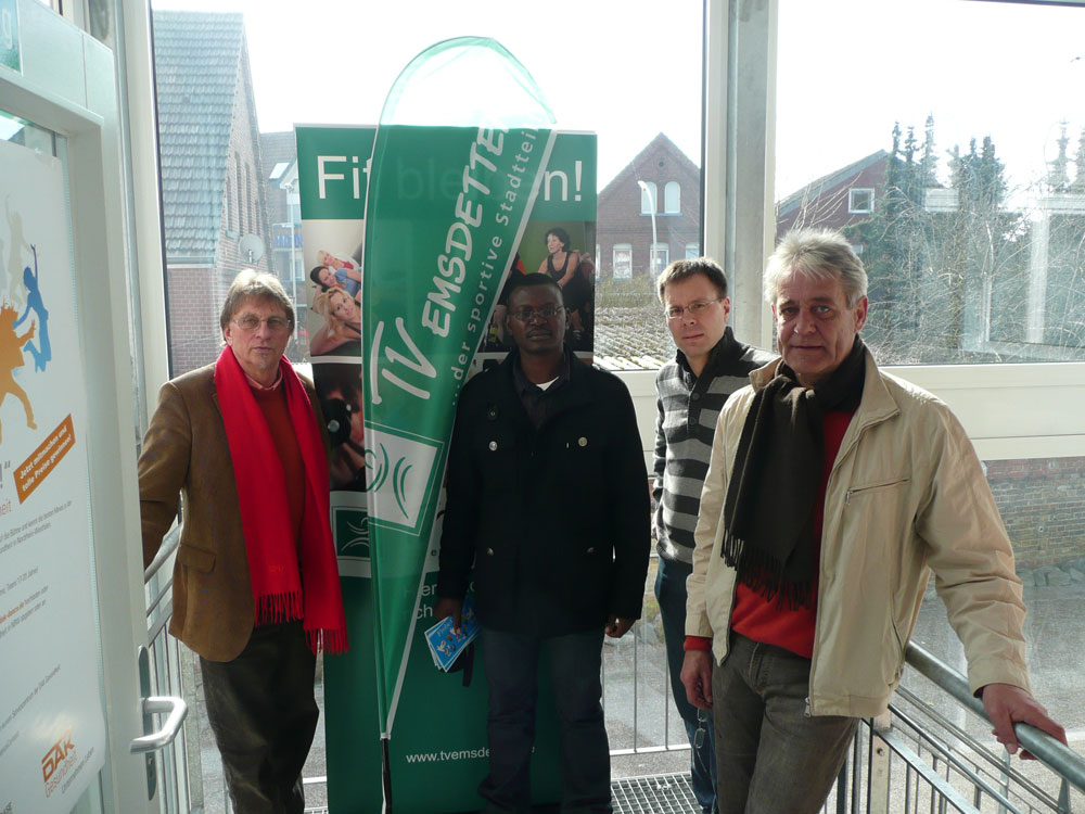 Besuch in der Turnvilla des TV Emsdetten. v.l.n.r. Reinhold Hemker, Gracious Moyo, Stefan Akamp (GF TV Emsdetten), Willy Meibeck
